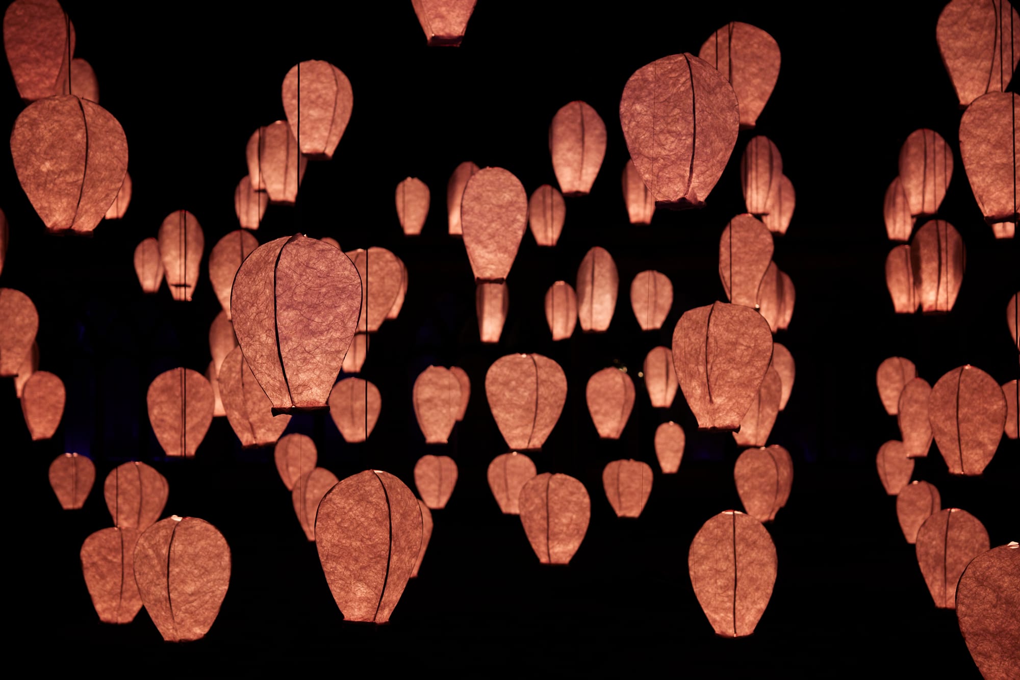 Solace by Amelia Kosminsky fills the Remembrance Hall with handmade, hand-sewn lanterns suspended mid-flight. Originally commissioned for Lumiere 2025. The soundtrack is by Jon Hopkins. After the intensity outside, you might need somewhere to stand still for a bit. This is that place.