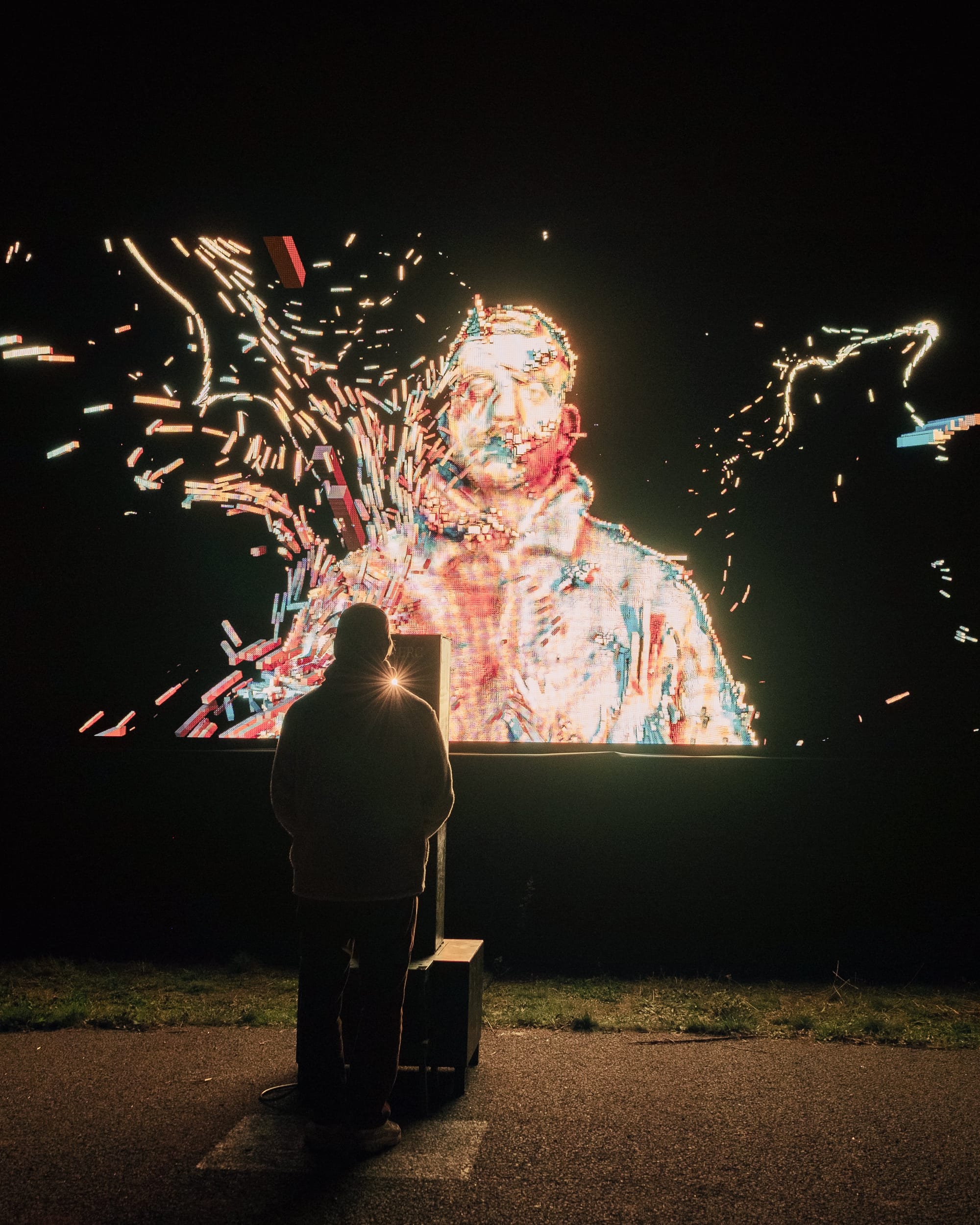 Mofingu by Dutch collective WERC is the most interactive piece in the programme. A depth camera tracks your movement and projects a point cloud onto an LED screen. Approach the screen and you'll see faces of previous visitors emerge and dissolve in cascades of coloured particles. Step into view and the particles scatter, then reform into your likeness. Move away and you become part of the archive, ready to appear for the next person.