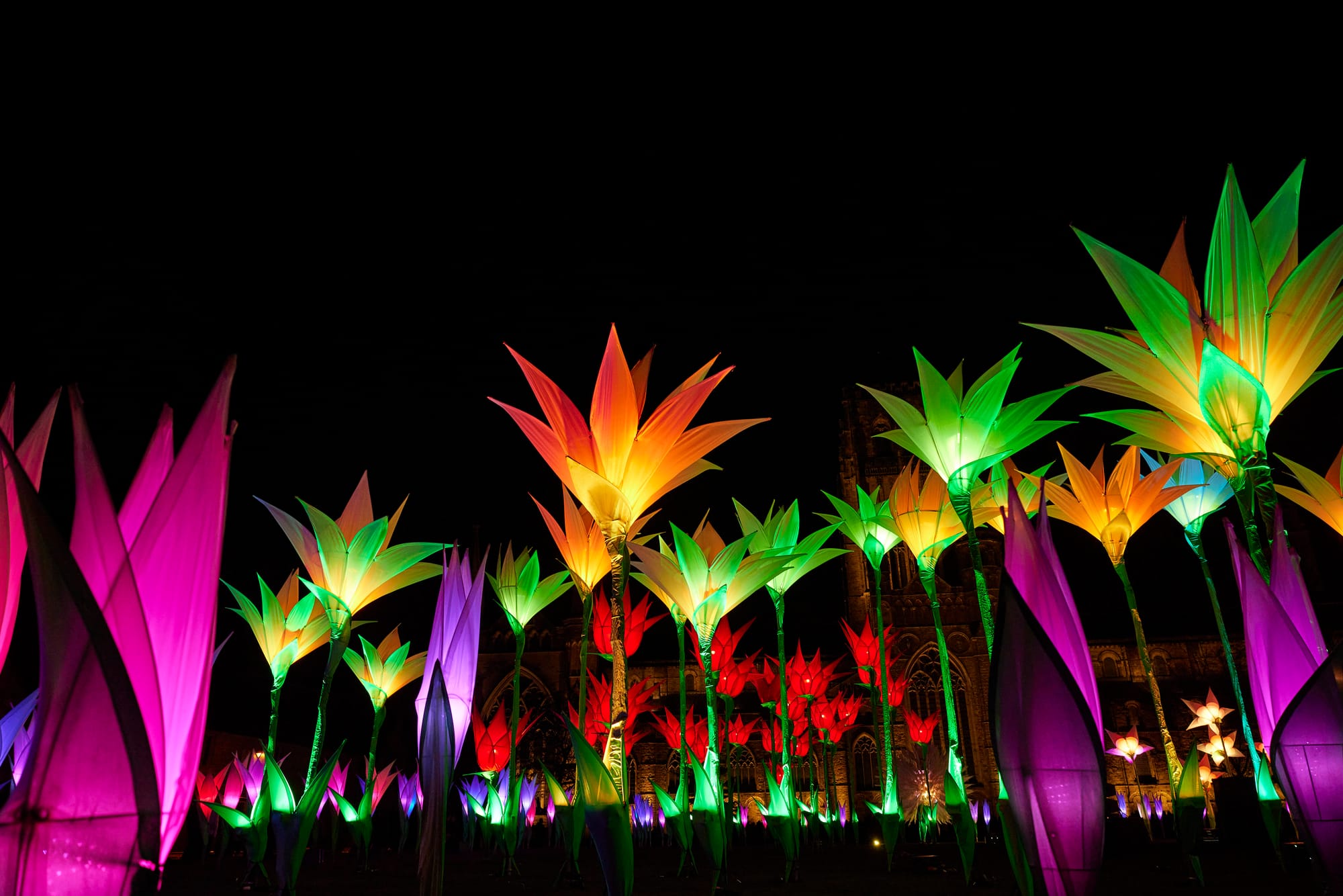 Jigantics Flower Field offers the opposite mood. Artist Jig Cochrane and team have spent two decades building this installation: a field of giant glowing blooms that tower overhead. It started as a commission celebrating the life of Body Shop founder Anita Roddick and has grown since, with new flower varieties added each season. The colours are bold without being garish.