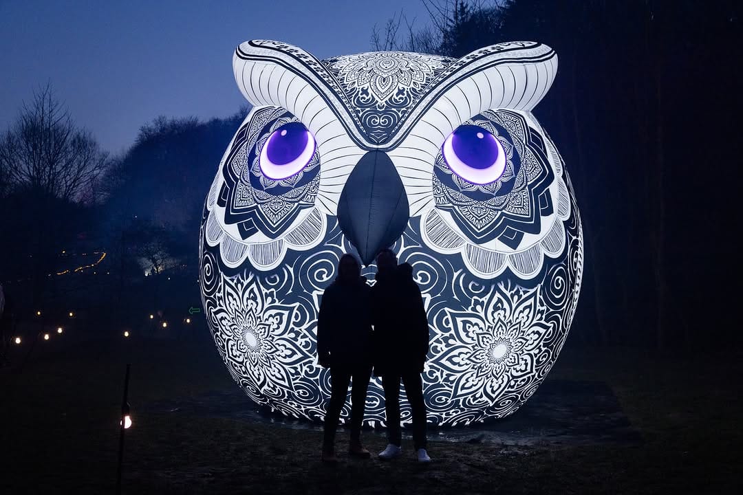 Glow Art Creations brings Nocturnal, a series of inflatable installations featuring larger-than-life glowing animals. Each creature is decorated with black and white mandala patterns that cast shadows and reflections when lit.