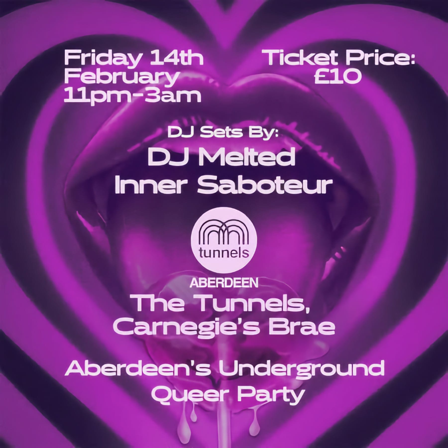 Sabotage is set to transform The Tunnels into a sanctuary of queer joy, blending music, art, and radical inclusivity this Valentine’s night. Headlined by Edinburgh’s DJ Melted, a trailblazer in Scotland’s LGBTQ+ scene, the night promises four hours of pop edits, disco reworks, and euphoric house beats. Resident DJ Inner Saboteur and dynamic hype dancers will keep energy high, while immersive art installations reimagine the space as a canvas for self-expression.