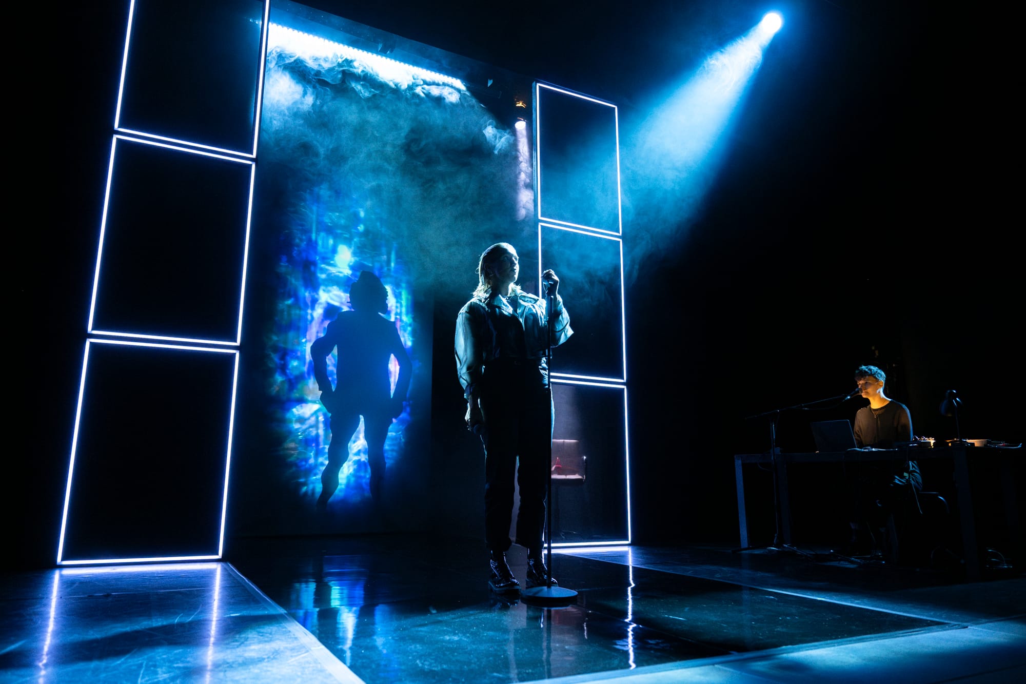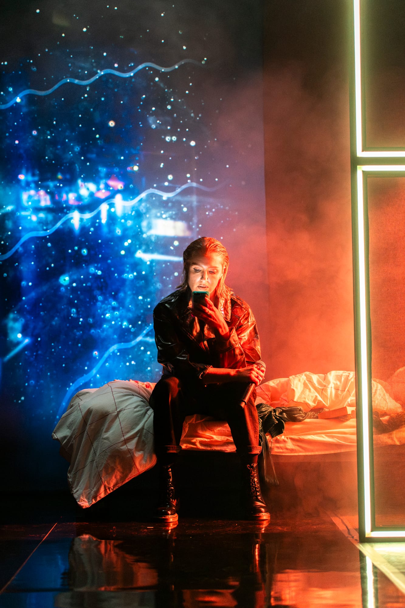 The performance combines spoken word, music, and video, creating a visual and auditory journey from darkness to light. The city comes alive with video projections, tracing a path through its streets at night, where images emerge from shadows in a vivid, illuminated landscape. The result is a compelling fusion of poetry and theatre, capturing the energy and complexity of urban existence.