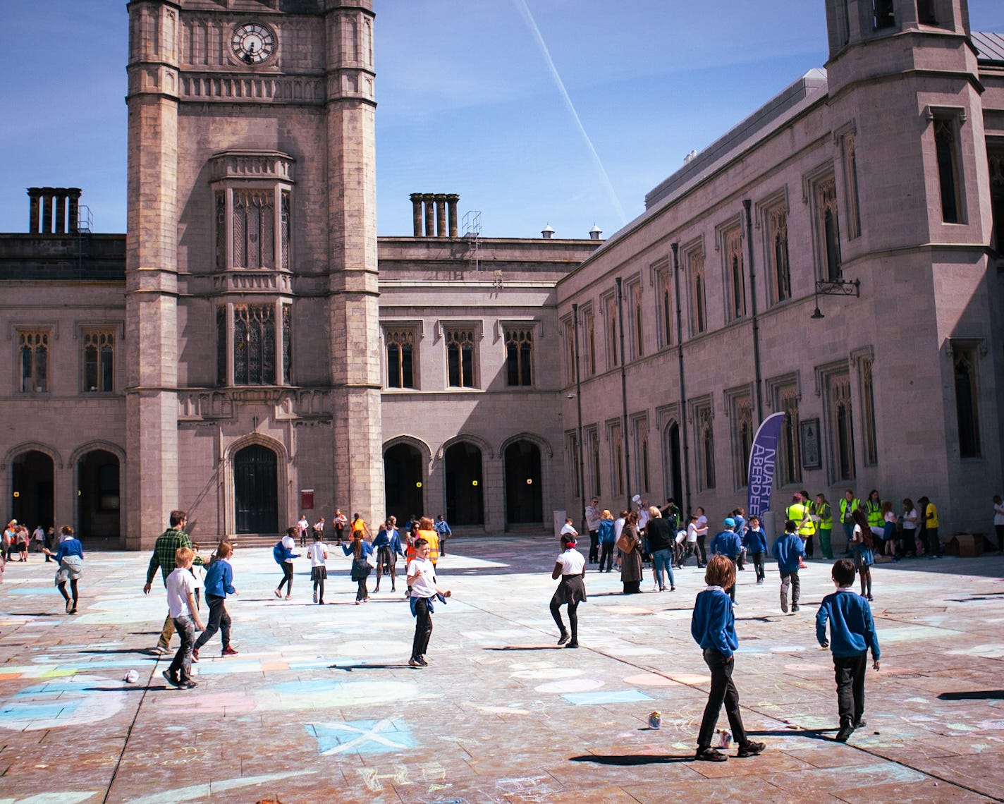 When Nuart first arrived in the city, it was widely known that the first rule to abide by was "DO NOT TOUCH THE GRANITE." However, this year, Katie collaborated with hundreds of city school kids to transform the granite flooring of the Marischal College Quad. The result was a magnificent display amidst the delightful chaos. The once lifeless grey floor was temporarily transformed into a vibrant coliseum of colour.