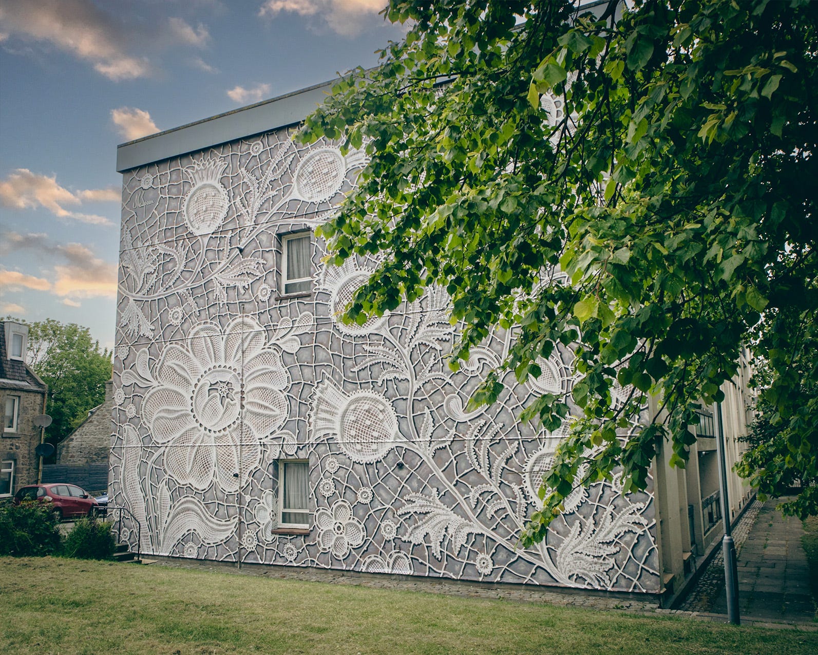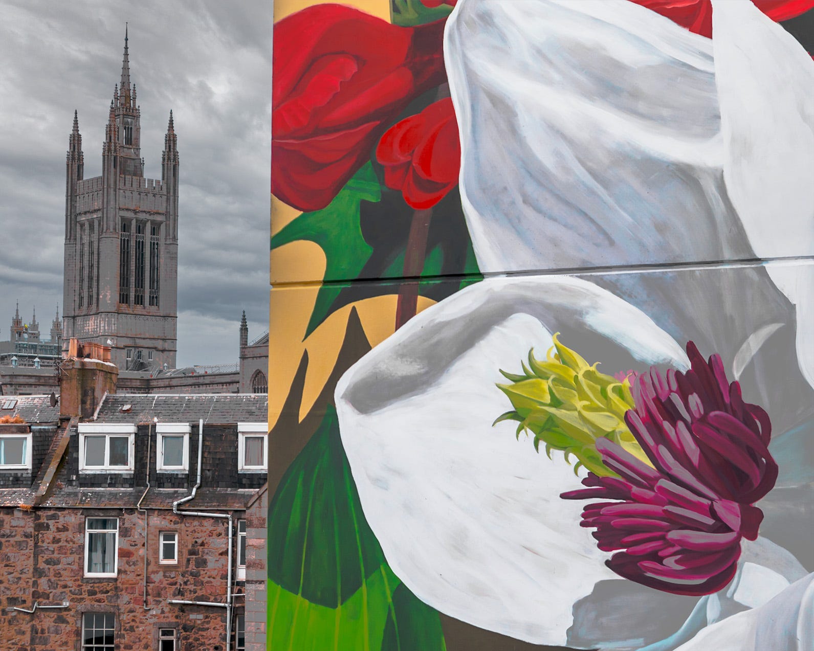 I love this mural from this year's Nuart Aberdeen. It has completely transformed a dull street adorned with ordinary buildings. The vibrant flowers in the artwork bring a striking burst of colour to the entire area.