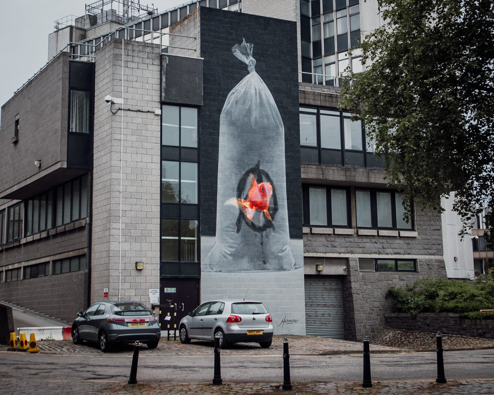 Their contribution to Nuart Aberdeen is the anarchist goldfish mural adorning the façade of the old Queens Street police station. Against the backdrop of the grey building, the vibrant artwork commands attention. The juxtaposition of the anarchist symbol with the goldfish, seemingly confined within its aquatic prison, creates a compelling visual contrast.