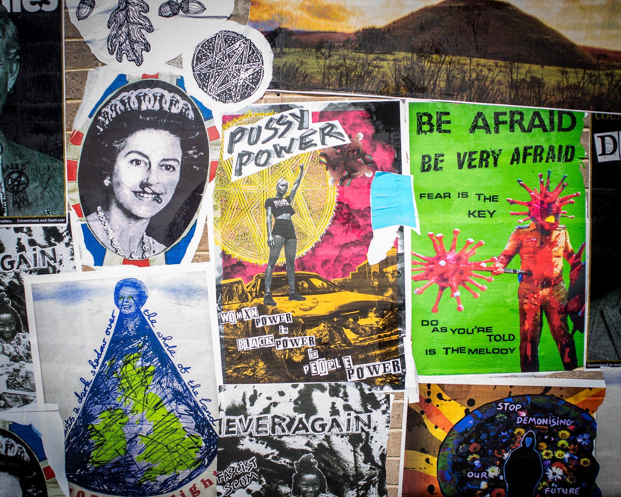 Aida collaborated with local youth to create an impressive group of paste-ups displayed in Crooked Lane. The chosen wall has been completely transformed, resembling a vibrant street scene from a comic book. The paste-ups feature protest posters that address the concerns of the city's diverse youth communities, making a powerful statement.