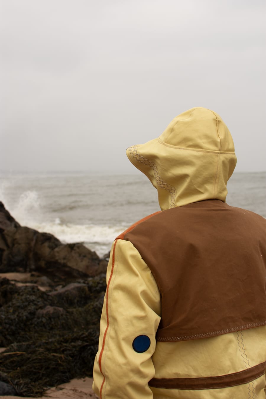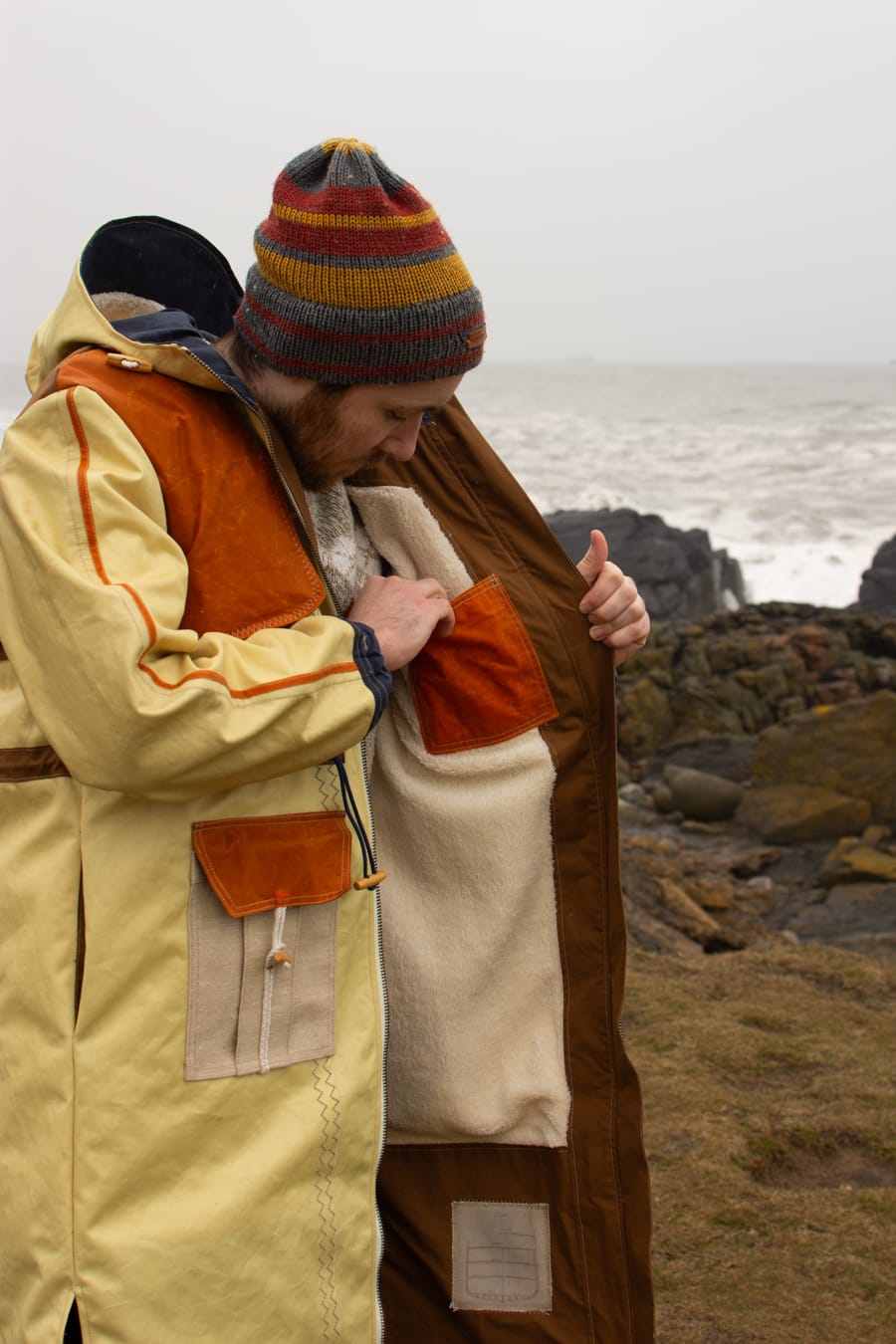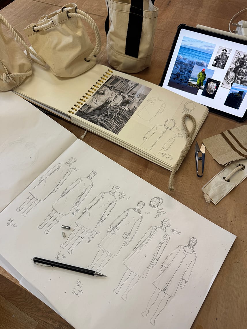 I designed a dry robe jacket and a set of modern ditty bags, inspired by the traditional round-bottomed bags once used by sailors. I drew on silhouettes and patterns from archival material at Aberdeen Art Gallery, the Maritime Museum and the Scottish Fisheries Museum in Anstruther.