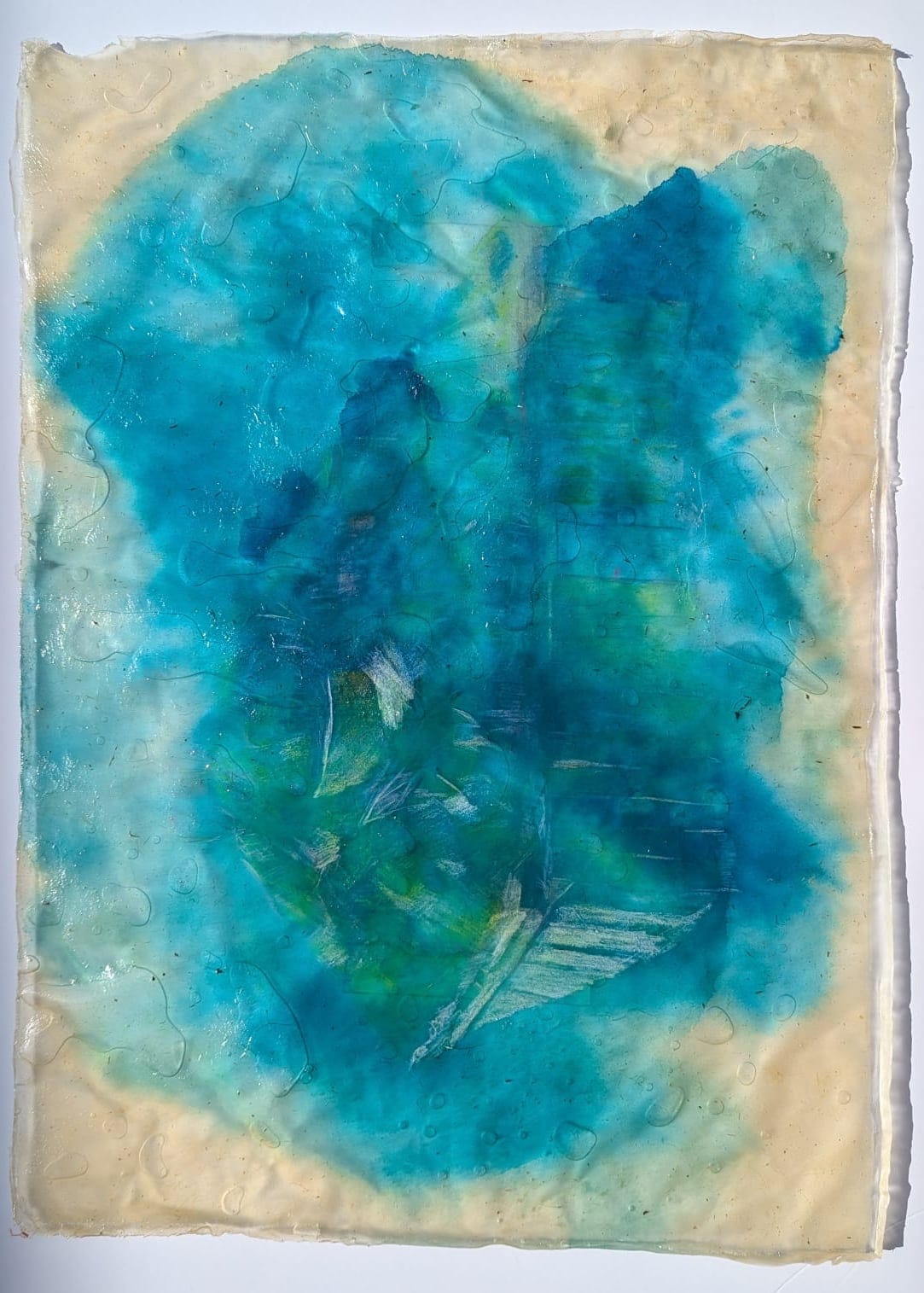 My work is mostly powdered charcoal and powdered pigments, some of which are then encased in resin. Blackdog Keek for example is a handmade paper (which almost dissolves in the resin) leaving the pigments to float back, stronger materials (such as the pencil used to detail the pillbox) come forward making the pillbox structure intangible, yet recognisable.
