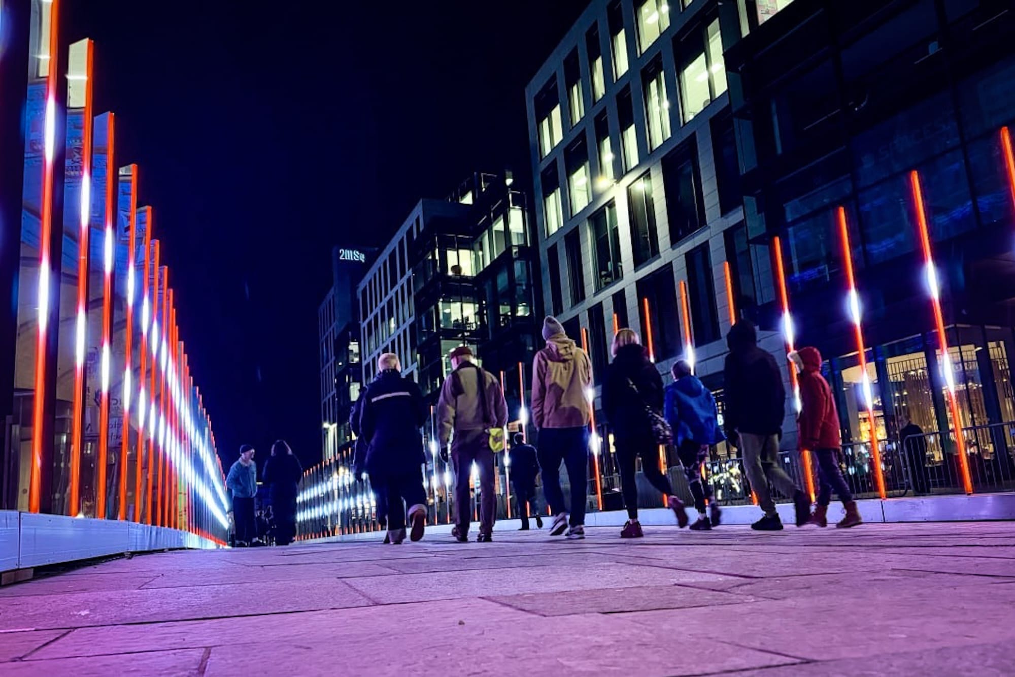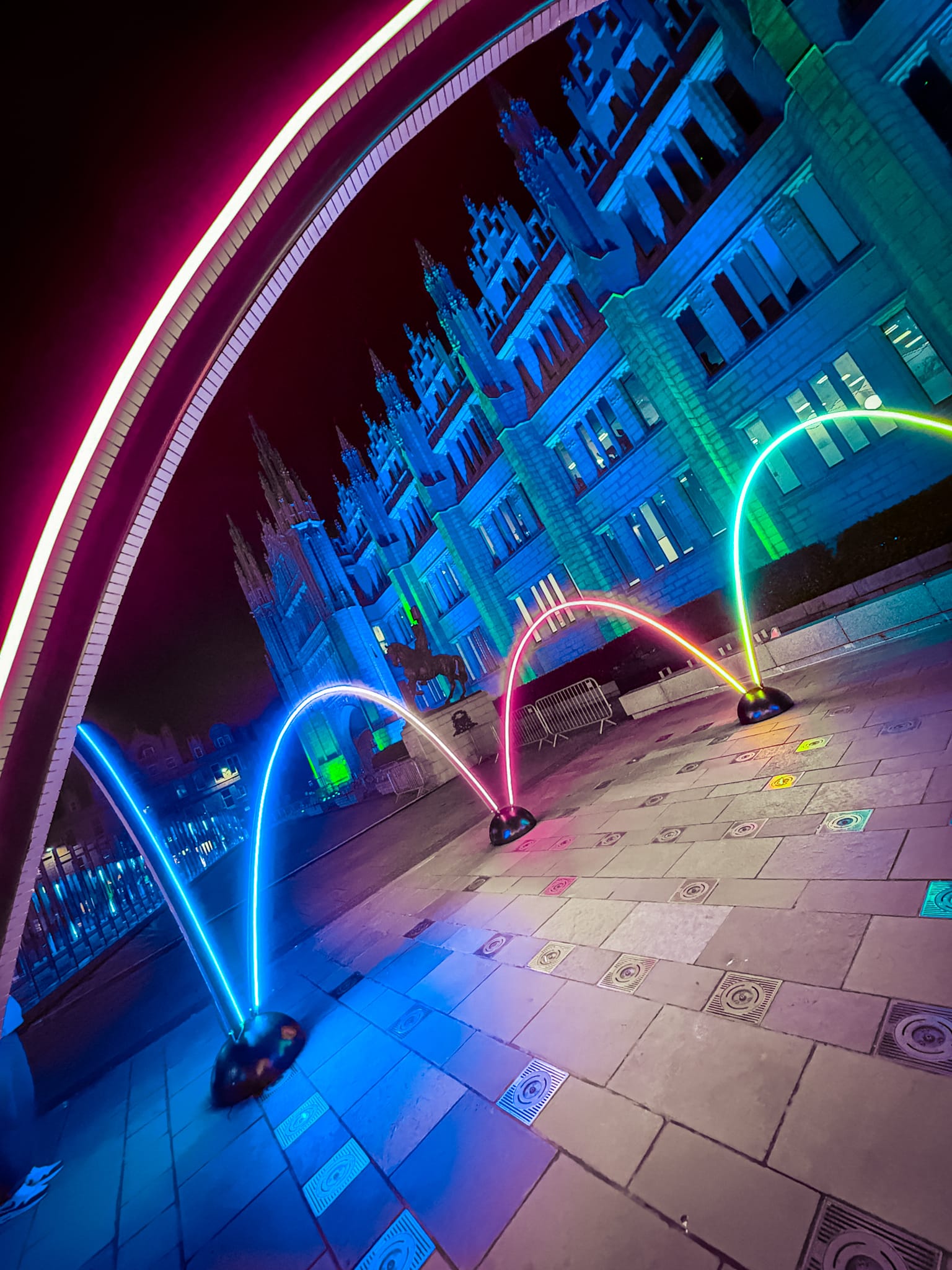 Reunion is a striking light installation celebrating connection and togetherness. Featuring curved arches of light reaching towards one another, it represents the act of gathering. Shifting colours mirror the movement of people coming together. Created by Edinburgh-based Kumquat Lab, it blends design, light, and technology to create an immersive experience.