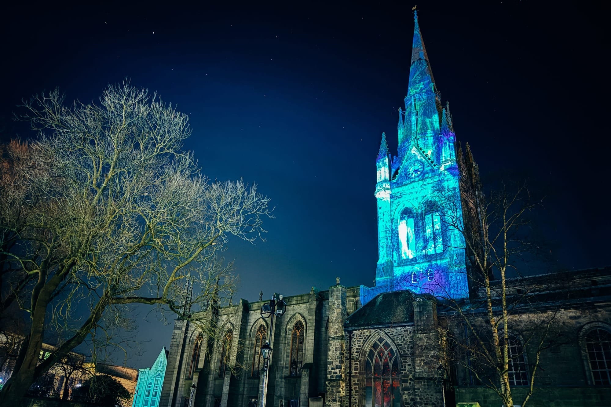 Voyage, a projection-mapping artwork at St Nicholas Kirk, brings the historic Clock Tower to life. This installation draws inspiration from Aberdeen’s seafaring heritage, using nautical maps, lighthouses, and underwater scenes to tell a story of the city’s maritime past. The vibrant visuals will immerse you in the city’s deep connection to the sea.