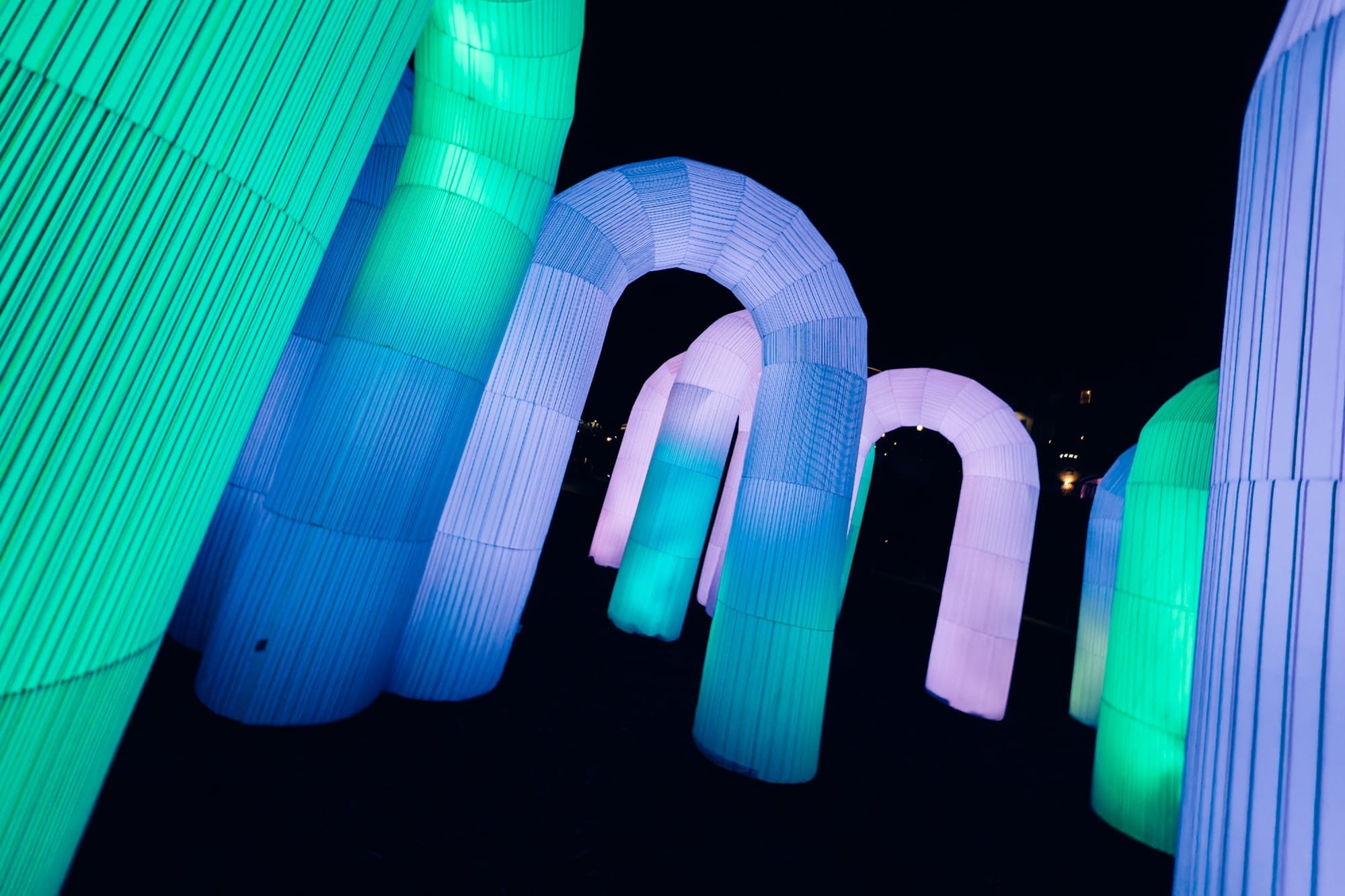 Sky Castle invites visitors to walk through a dreamy, interactive landscape of inflatable arches. As you move through, your movements power a melodic xylophone soundscape that progresses and changes the colours in each arch. The installation creates an immersive experience, where light, colour, and music combine to evoke the joy and hope rainbows bring after every storm.